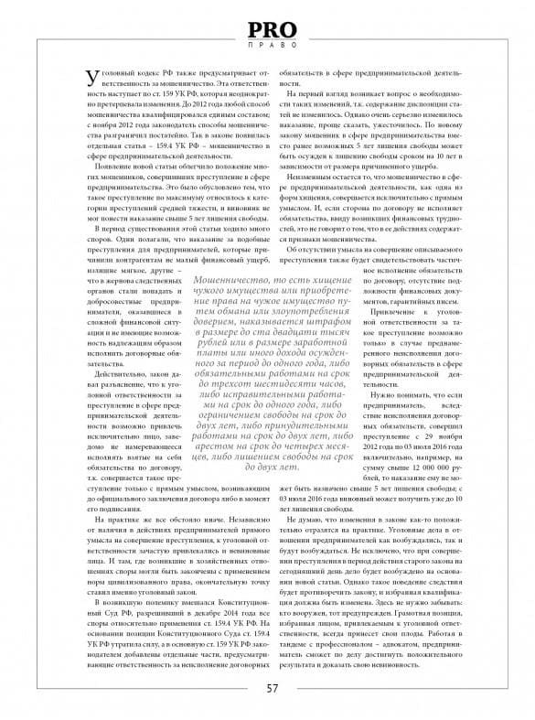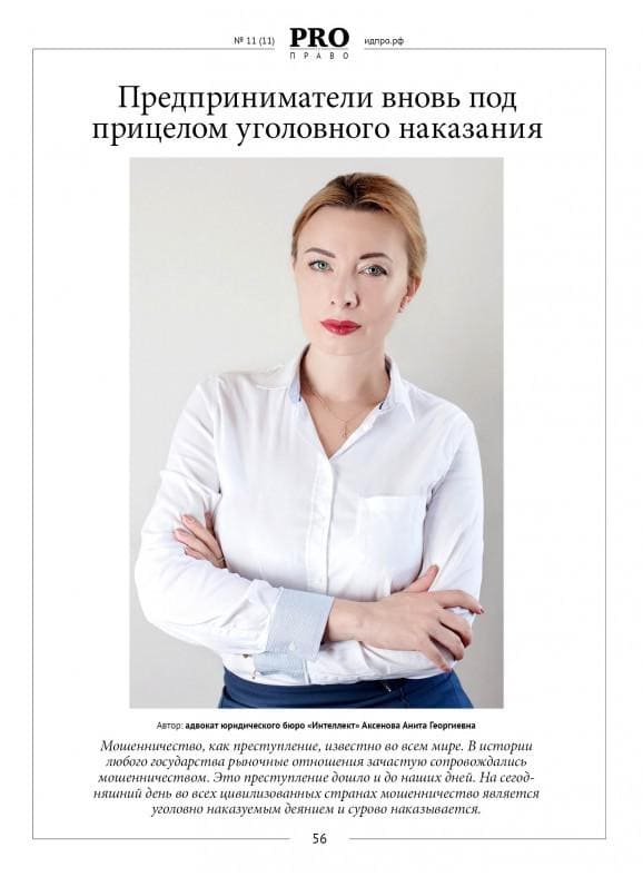 Публикация статьи "Предприниматели вновь под прицелом уголовного наказания" Аксёнова А. Г. в журнале Pro Бизнес